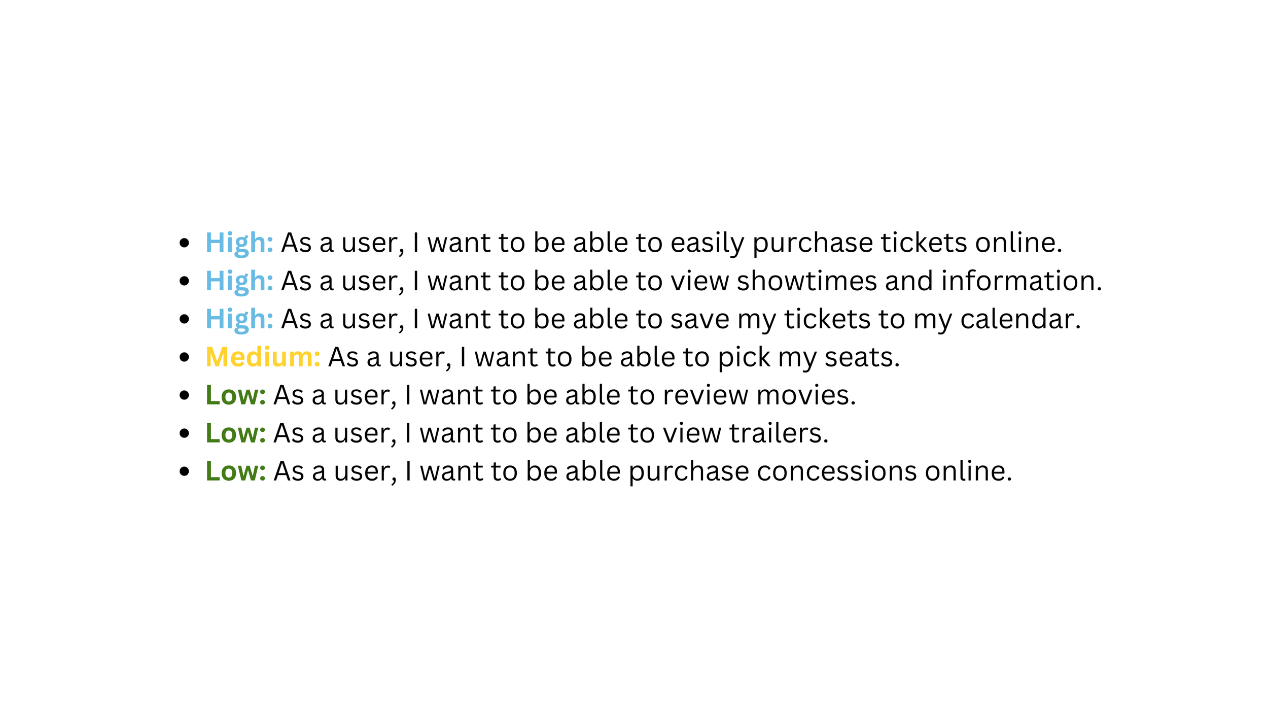 To ensure that the website of Cine-Movie meets the needs of its users, a list of user stories was created to identify the features required. The user stories were categorized based on priority that would benefit the user and the website, with high-priority stories being the most important, followed by medium and low priority stories. The high-priority user stories included the ability to easily purchase tickets online, view showtimes and movie information, and save tickets to their calendars. The medium-priority user stories included the ability to select specific seats and view a seating chart. The low-priority user stories included the ability to view trailers and reviews of movies, as well as the option to purchase concessions online. By prioritizing these user stories, Cine-Movie can ensure that its website caters to the needs of its users and provides a seamless and enjoyable movie-going experience.