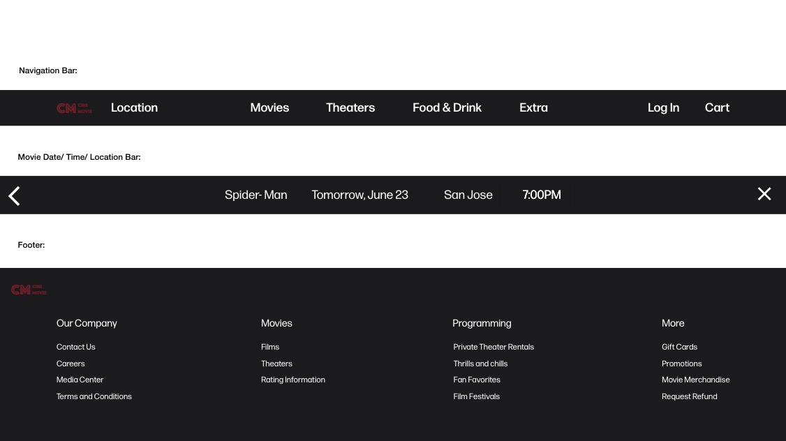 Wireframes are an essential part of designing the website for Cine Movie. Using Adobe XD, I created wireframes that feature a simple and modern design inspired by Apple TV and AMC. These wireframes helped me refine the layout of each page, prioritize essential functions, and ensure the user experience is seamless. With the website, users can browse and watch trailers, find theater locations, buy concessions, select a seat, save tickets to the calendar, and complete checkout with an easy flow.