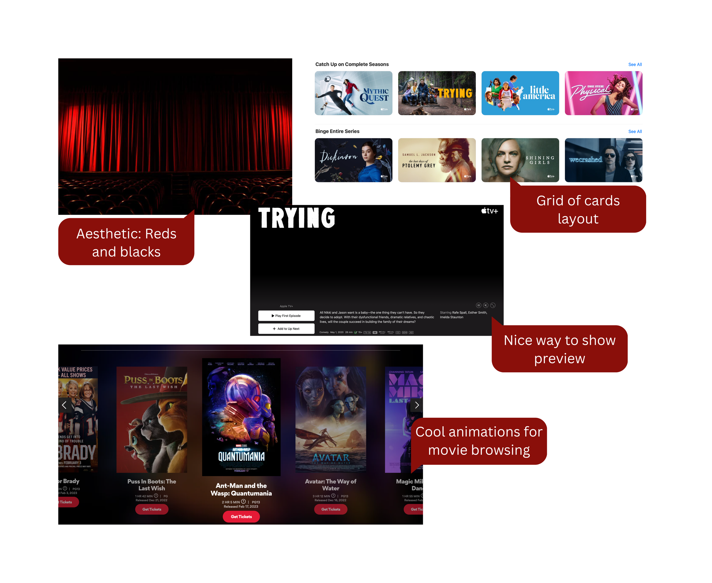 Exploring various screen designs helped me gather inspiration and ideas for the overall look and feel of Cine Movie's website. This included considerations such as layout, colors, typography, and visual style. By gathering inspiration from sources like theaters, AppleTV and AMC, I was able to focus my design decisions and create a cohesive and visually appealing design that reflects Cine Movie's brand identity.